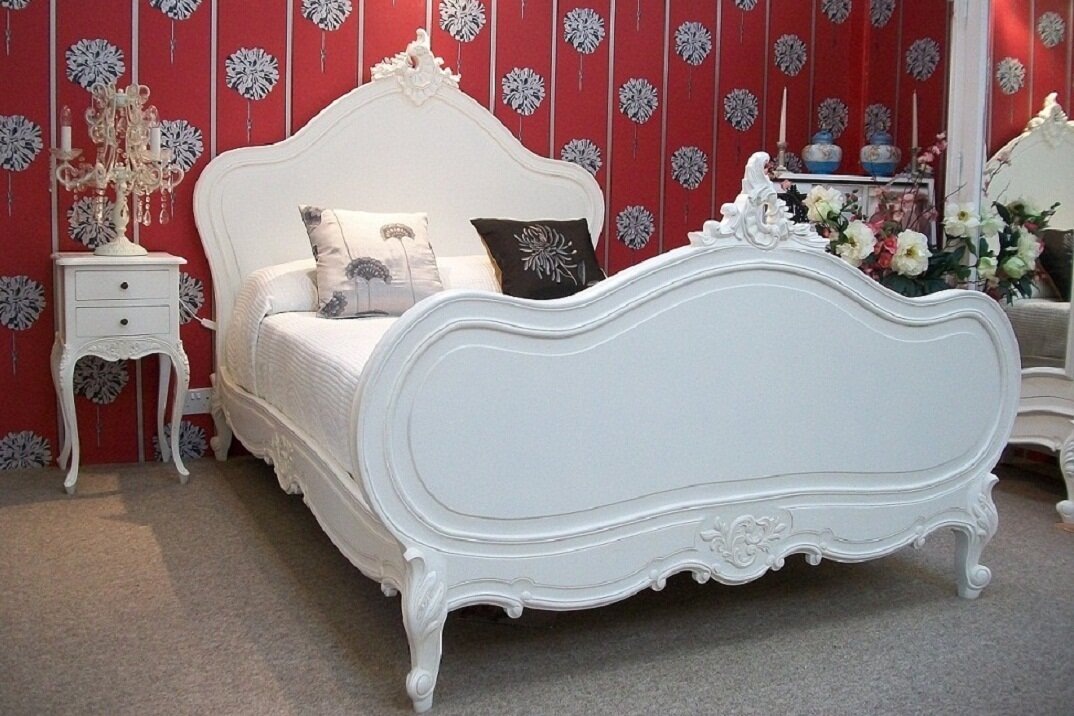 Provençal antique style period French beds and French Bedroom furniture, made from solid hardwood, mostly Mahogany with beautiful carved features, hand finished in an antique faded white painted finish. Larger flat pieces in some items may be medium density fibre board to allow for stability in all envoirements. Our Provençal style bedroom range is lightly distressed to give three centuries of gentle wear and tear and oozes glorious textures.